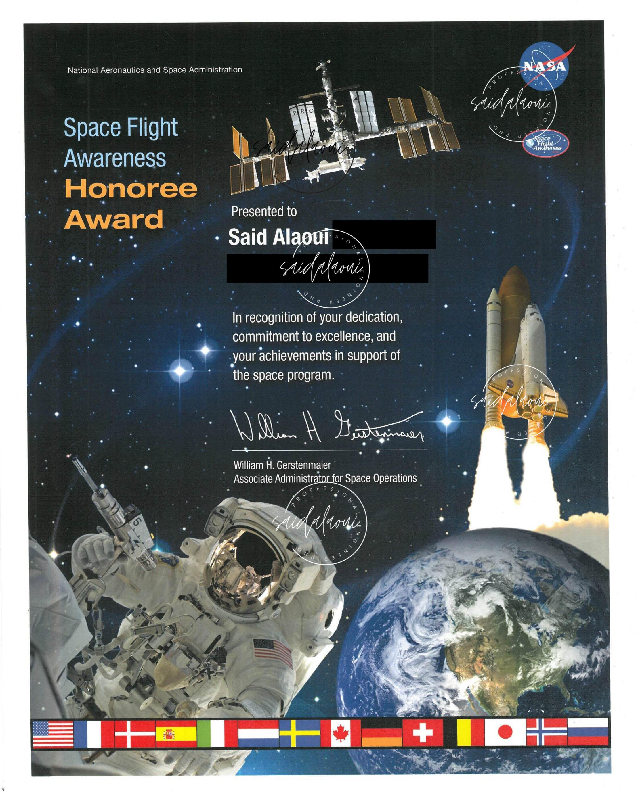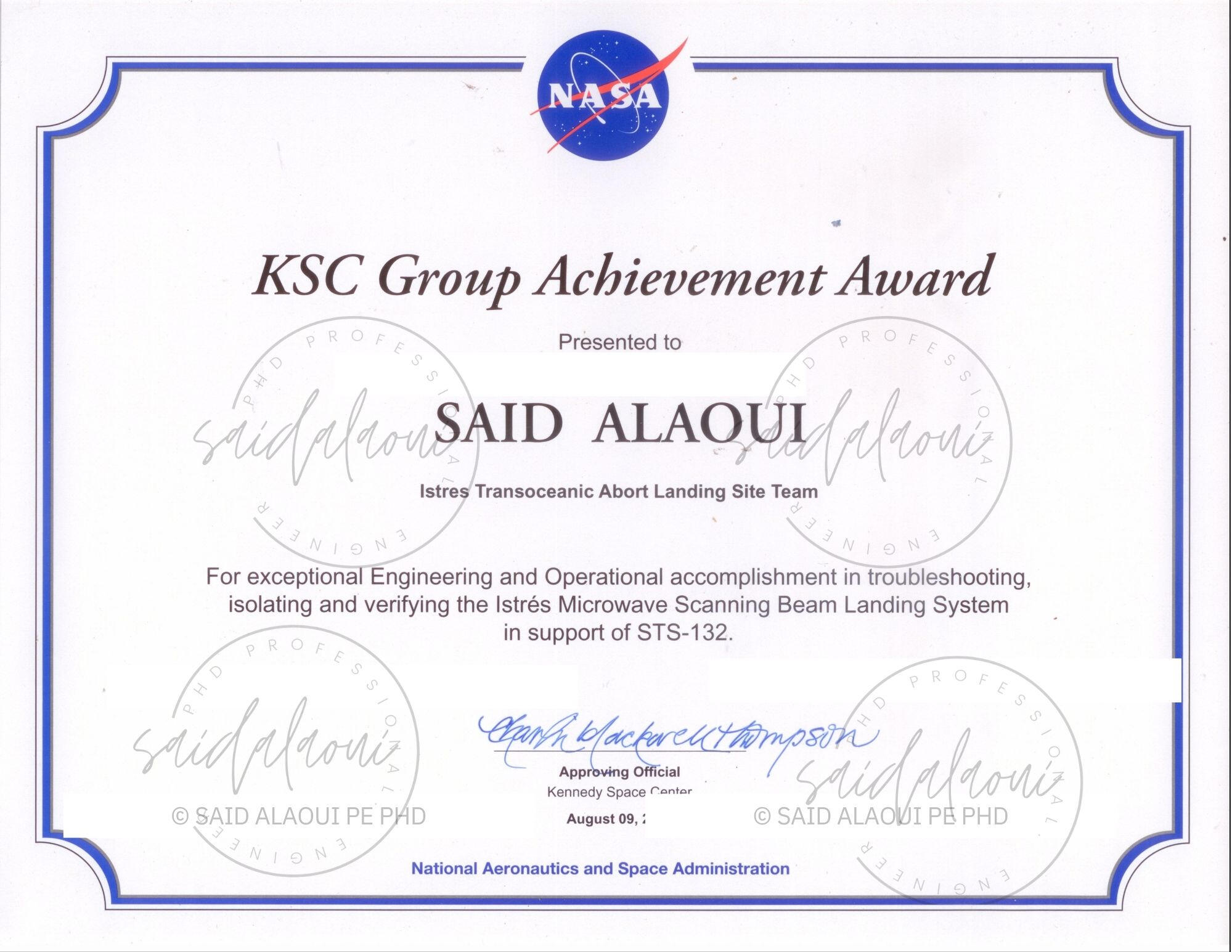 Launch Vehicle Processing_"Mr. Alaoui has a pleasant demeanor and works well with all personnel and is a forward thinker. He anticipates potential problems and work stoppages and is always planning mitigation strategies to alleviate NASA's concerns. Numerous times his efforts were directly responsible for the airfield readiness in support of a Space Shuttle landing.